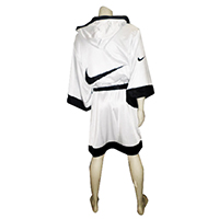 This Nike Boxing Robe is made of 100% Satin. Complete with pockets, belt and hood. Sleeves are cut 3/4 length pro style. Suitable for all levels. Nike Brand Logo on the back and on the sleeves.